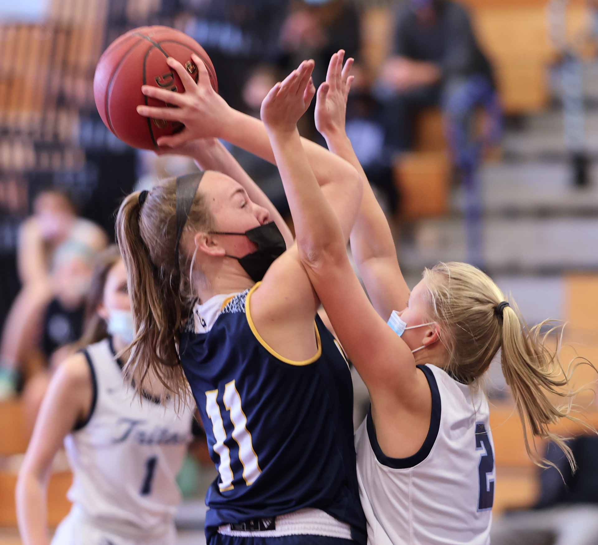 - Paige Leavitt of Triton pressures a Lynnfield shooter.