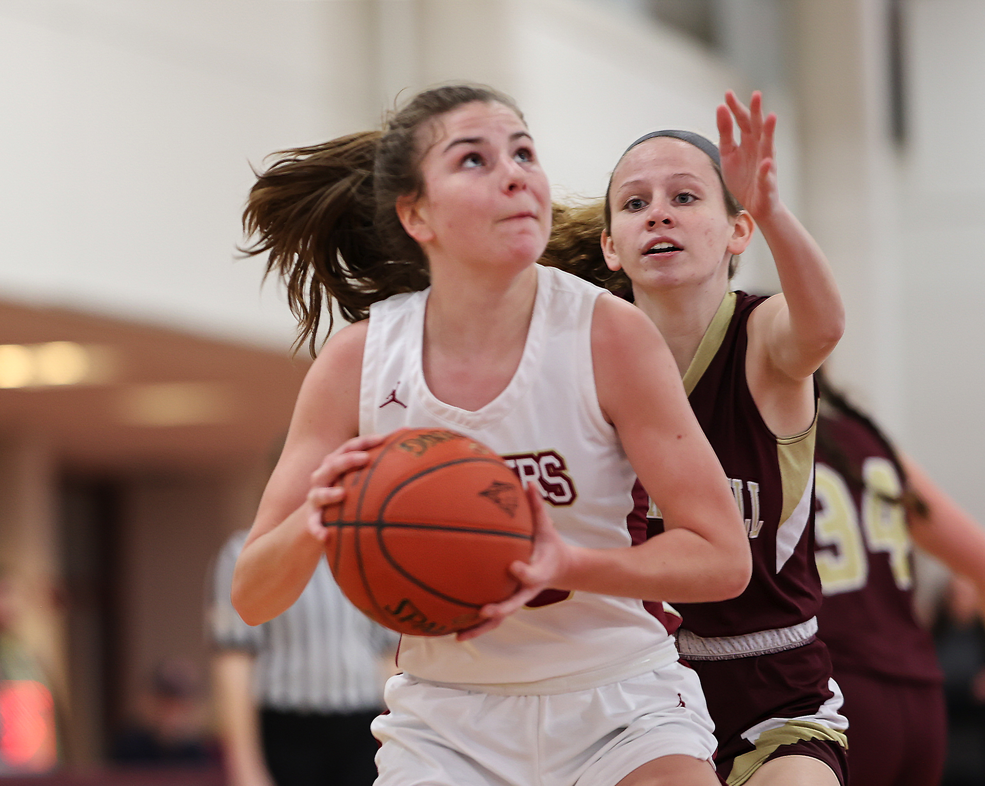 - Anna Seidel plays defense against a Shepherd Hill player during Newburyport’s tournament game on March 5th.
