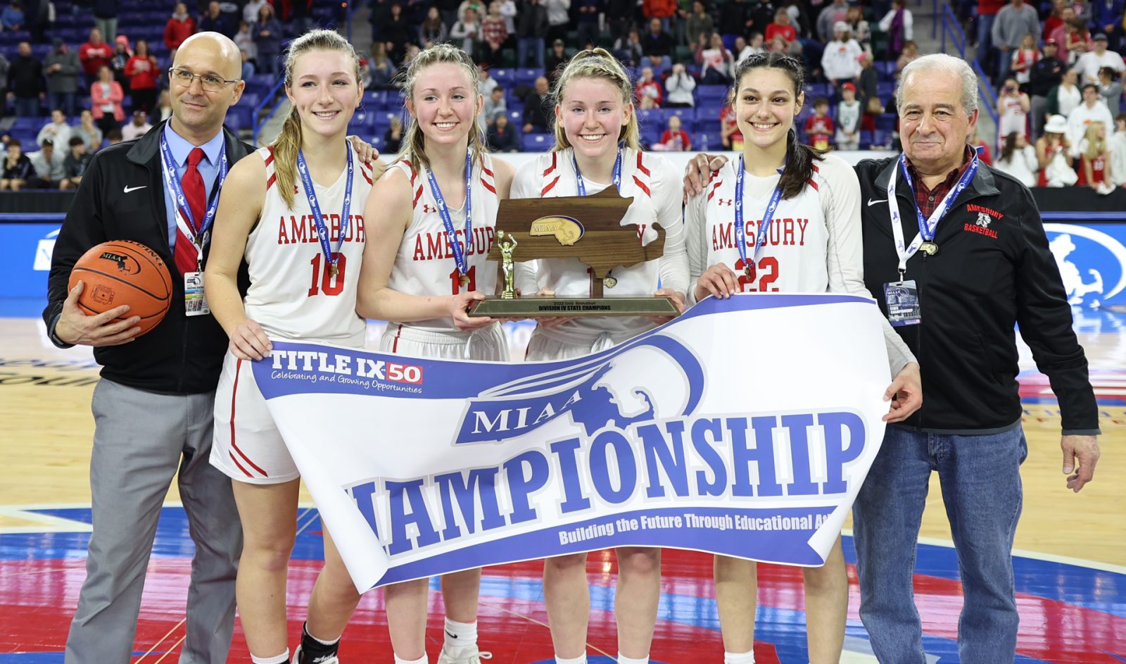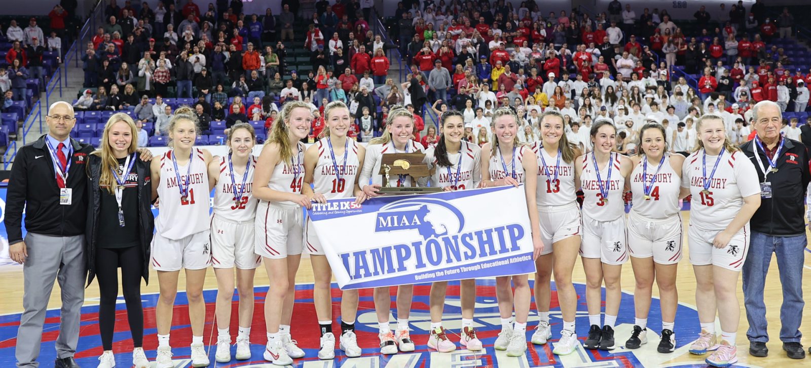 - Amesbury girls team behind the Division 4 championship banner after win over Millbury in championship game on March 19th.