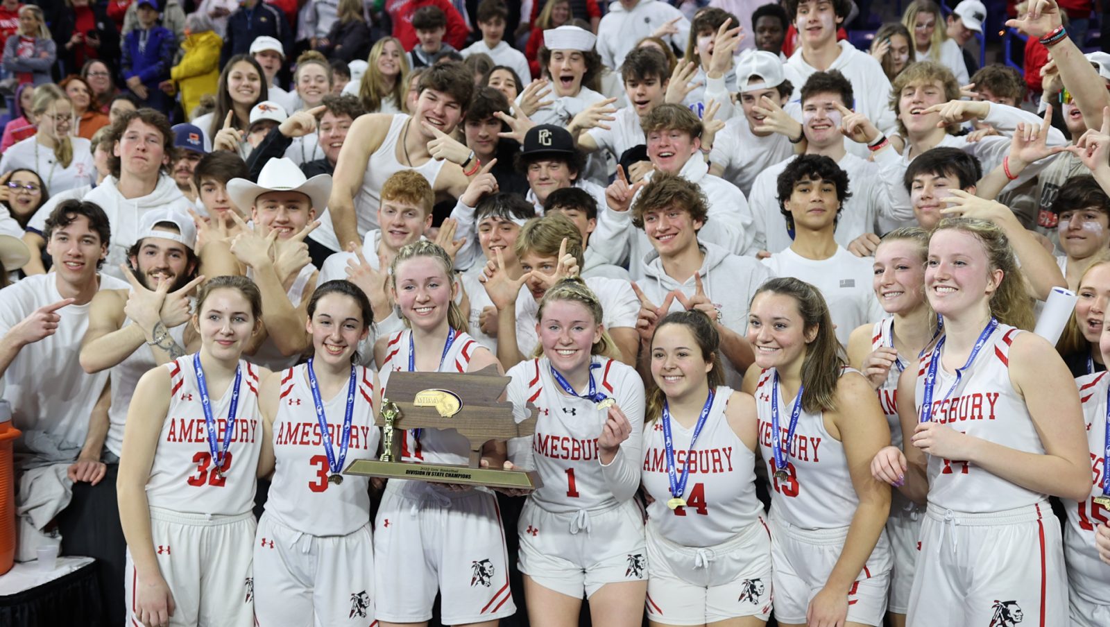 - Amesbury girls basketball team in front of their student section with the Division 4 championship trophy.