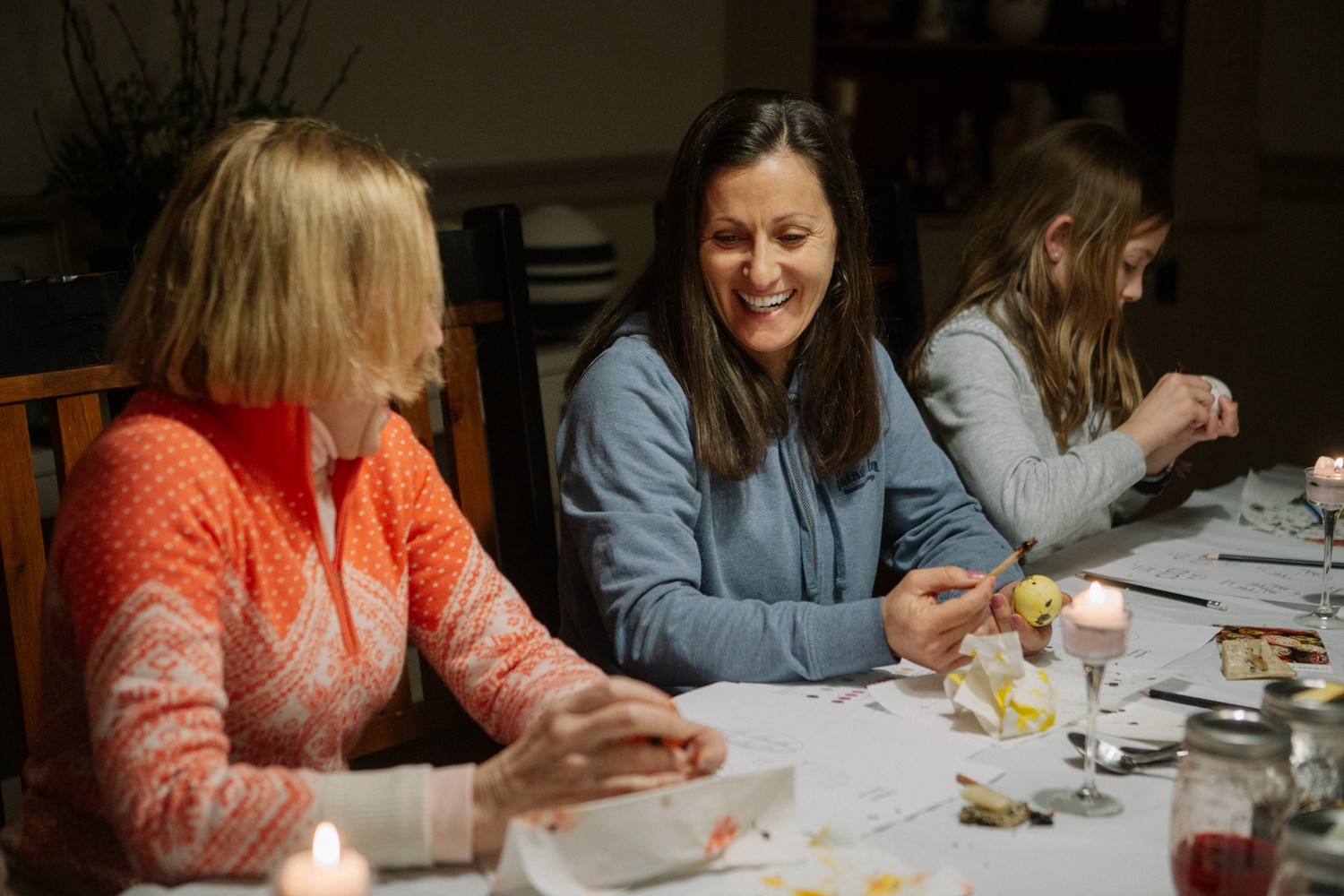 - Volunteers chat at their pysanky for the project party in Rexford, NY, March 20, 2022