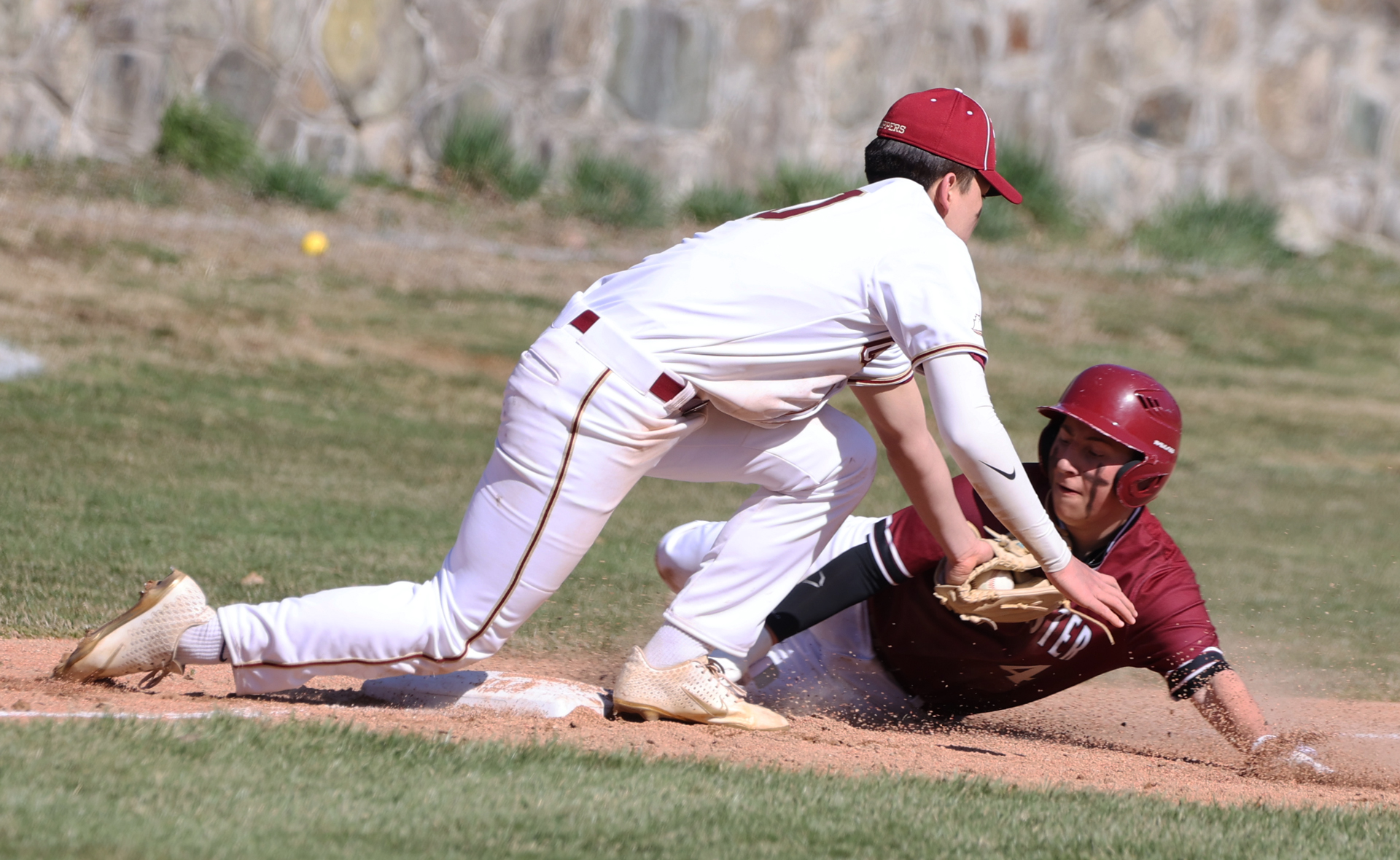 - Newburyport third baseman Owen Tahnk tags out a Gloucester baserunner on Saturday afternoon.