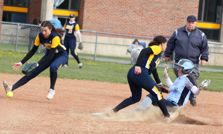 - Grace Romine (Triton) steals second as the throw gets away from the Malden Catholic infielders.