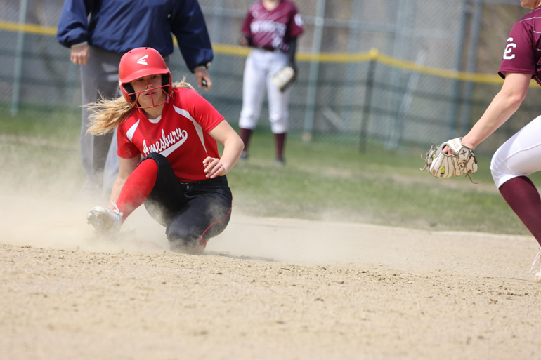 - Ella Bezanson (Amesbury) gets into second base safely against Concord-Carlisle on April 30th.