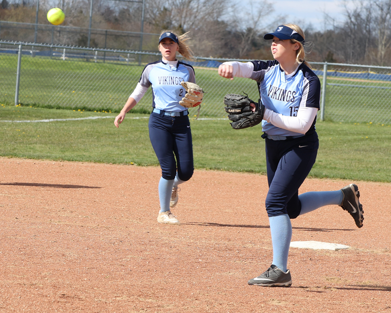 - Triton second baseman Maddy Jacques throws to first during their April 29th game against Malden Catholic.