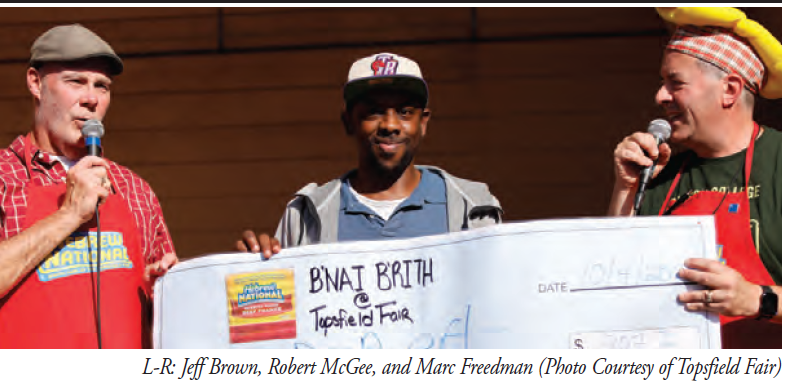 TOPSFIELD, MA – Robert McGee of Rockaway, NY, won the 7th annual Topsfield Fair Hot Dog Eating Contest on Saturday, eating 13 quarter-pound hot dogs (the equivalent of 3.5 pounds) in buns in the allotted 7-minute time. He set a new record, beating the old record set in 2023 of eating 10 hot dogs. He was awarded the $207 to celebrate the 207th Topsfield Fair. McGee was joined in receiving his award by Jeff Brown from WBZ News Radio 1030, who co-hosted this year’s contest and  Marc Freedman with the Bnai Brith Booth at the Fair, which sponsored the contest. ♦