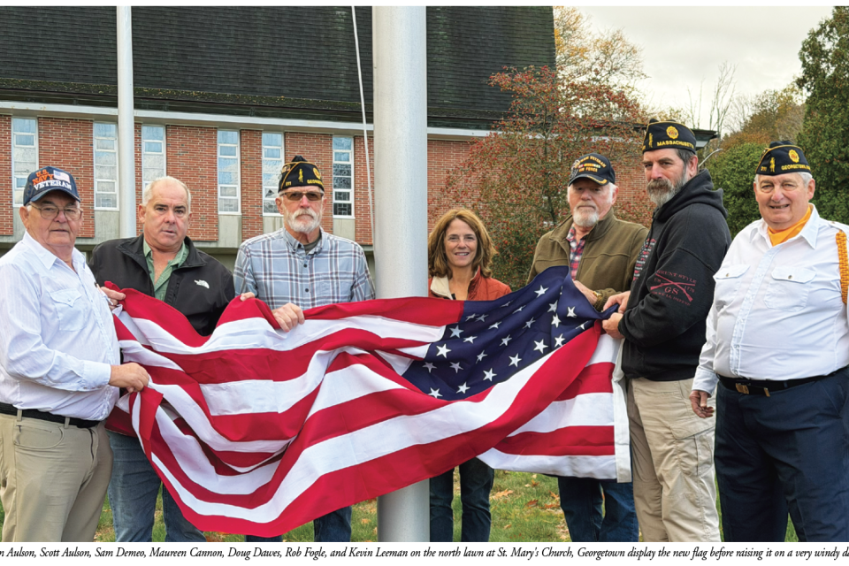 Members of the Georgetown American Legion joined with Maureen Cannon of St. Mary’s Church in a flag-raising ceremony that the Legion performed to replace the huge flag flying on the church’s north lawn, adjacent to Rte. 133 (Andover Street) last Saturday.