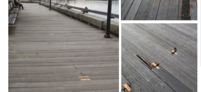 Built originally in the 1970s and rebuilt in 2001, the city chose to use Southern pine boards, which are prone to splintering. And the quality of some of the fasteners that held the boards to the substructure “were not the best quality,” said senior city planner Geordie Vining.