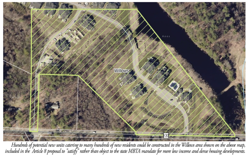 Passage of the article will embrace multi-family development opportunities to an area of the Willows development. This would allow construction “by right” of high-density multi-family buildings in the area adjacent and surrounding and within feet of single-family $1.2+ million homes in the area.
