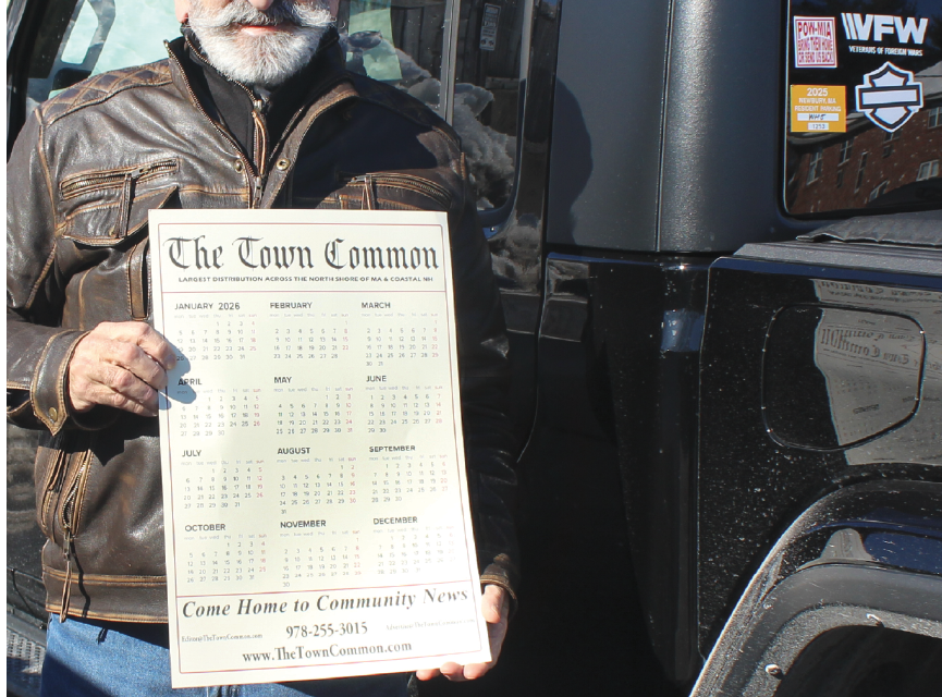 NEWBURYPORT – Veteran Realtor Frank Bertolino with The North Shore Realty Group holds a 2026 holds the 2026 The Town Common calendar in the parking lot of Giuseppe’s restaurant on Low Street.