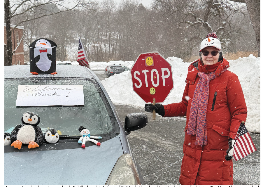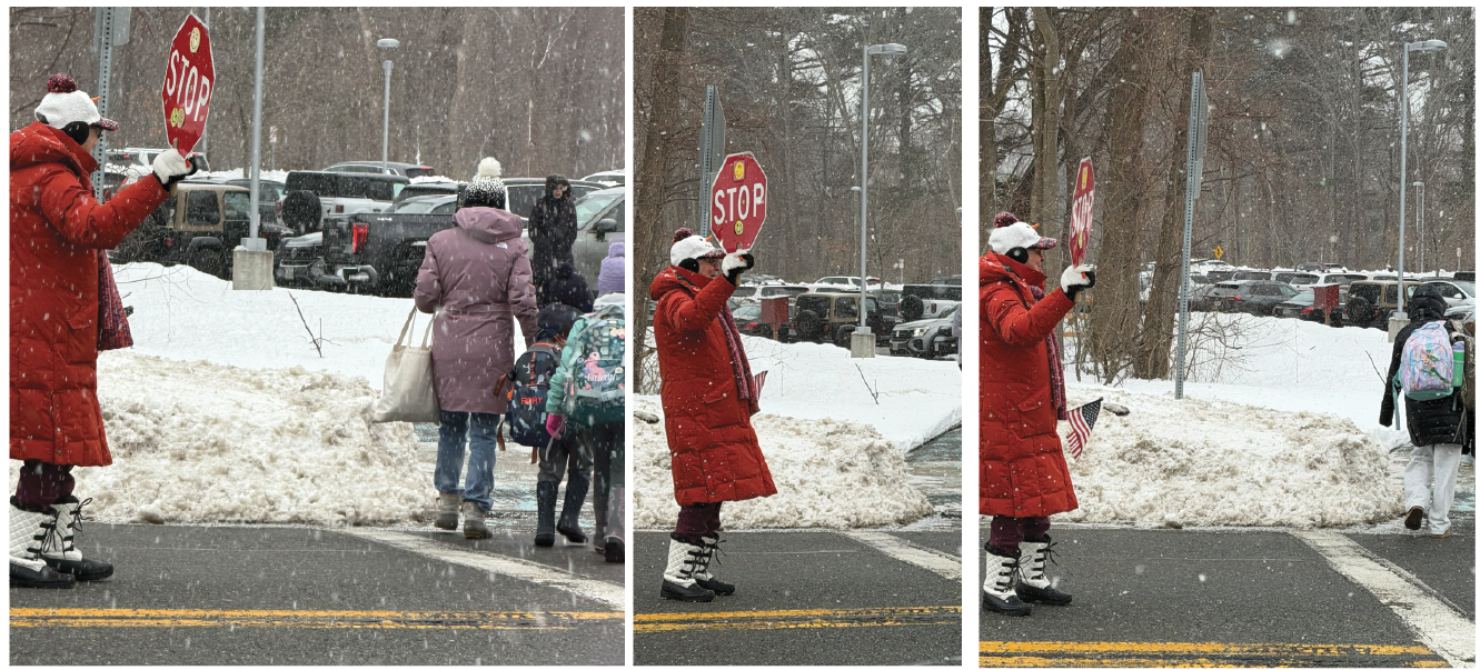 Judy Robillard welcomes students back from winter break as she performs crossing-guard duties across from the Pine Grove Elementary School in Rowley. Judy has been safely guiding and bringing cheer to students and their parents for 39 years!