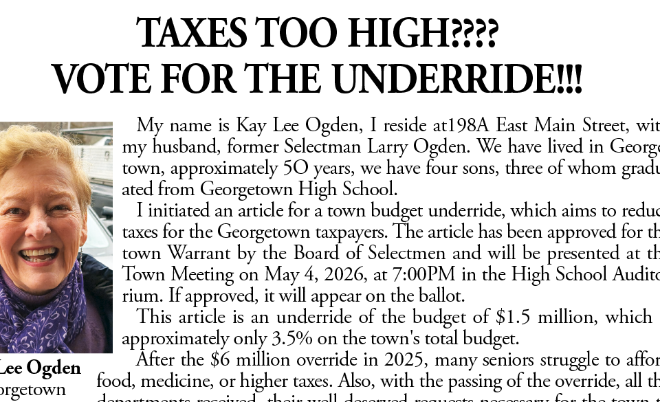 After the $6 million override in 2025, many seniors struggle to afford food, medicine, or higher taxes. Also, with the passing of the override, all the departments received, their well-deserved requests necessary for the town to function! I appreciate, the fire, police, council on aging, schools, highway, and all the departments in Georgetown, that make Georgetown, “A PEARL OF A TOWN” (Fred True) to reside in! I am not against any departments; I honor them for what they do for our small town!