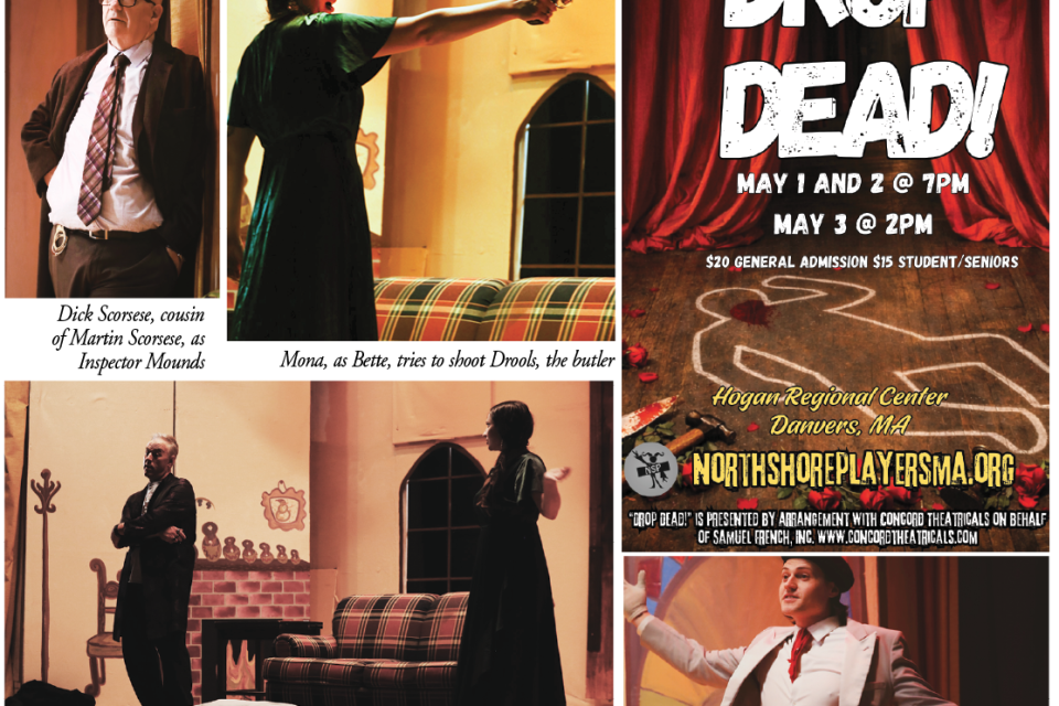 The North Shore Players, a community theater in Danvers, presents the comedy-murder-mystery “Drop Dead!” A cast of has-been actors, led by an insane director, is trying to stage a murder-mystery. Then the real murders happen. It’s at Hogan Regional Auditorium, 450 Maple St., Danvers. Curtain is at 7 p.m., May 1 and 2, and 2 p.m. on May 3. Tickets, $15-$20, and other information at www.north shoreplayersma.org. The North Shore Players is a 501(c)3 non-profit, and has been on the North Shore since 1957.