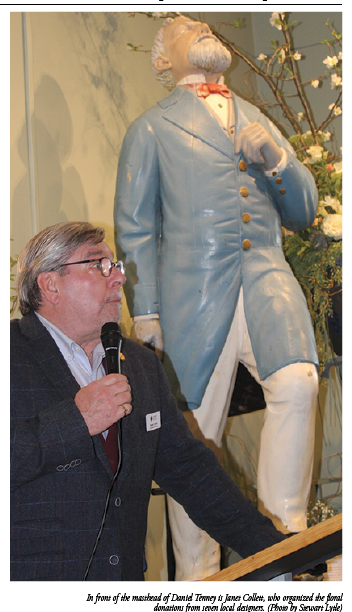 All 13 of the designs were inspired by the art and artifacts in the museum. Members were encouraged to bid on the arrangements. Russell said he may keep the Beach Plum arrangement next to Tenney “for a while,” as Jay Lesynski of Merri-Mar Yacht Basin finishes building the new base. His base will allow the statute to be positioned at a 45-degree angle, as it was on the ship.