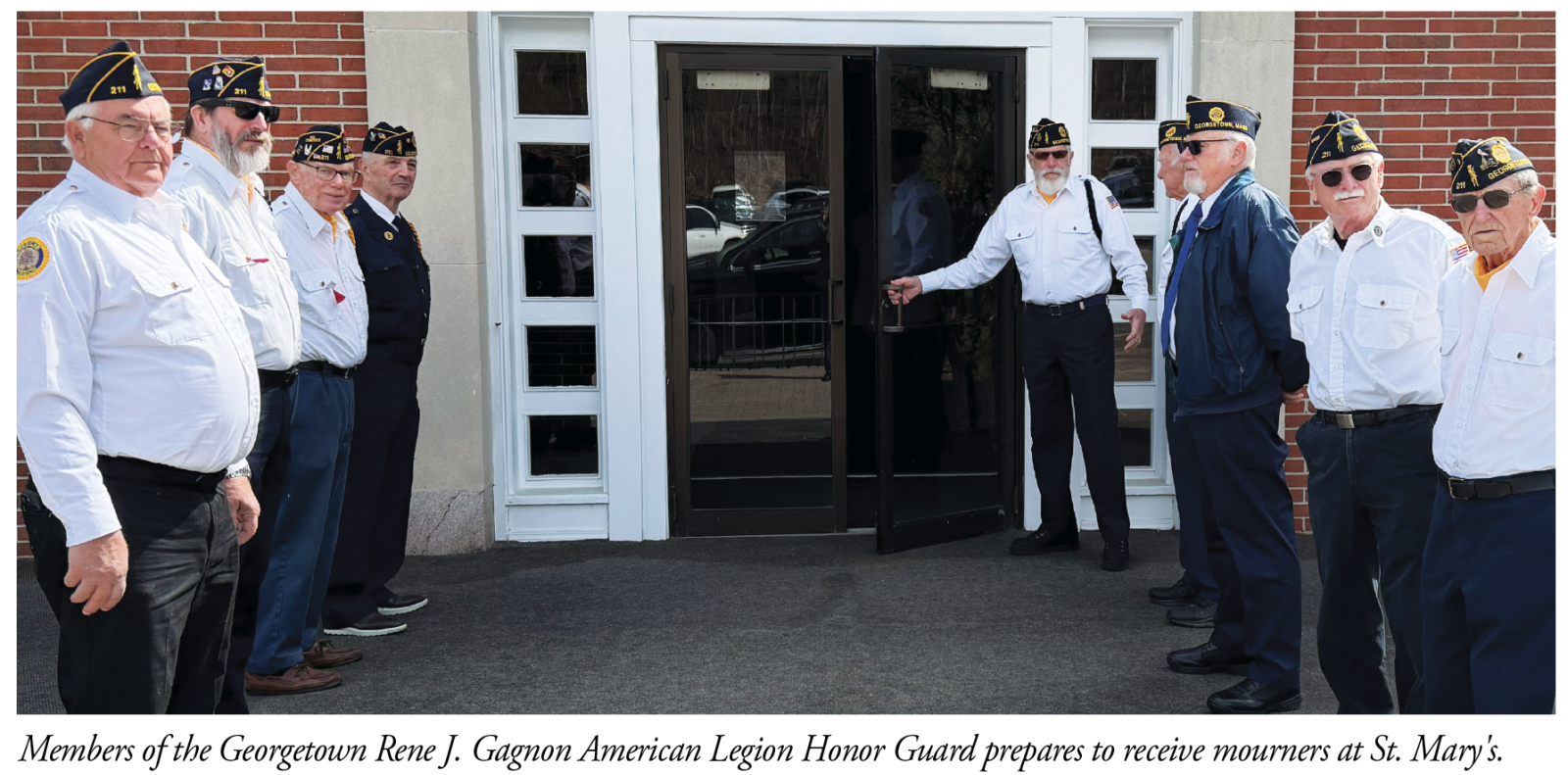 A glance around the pews showed an outpouring of new and old, including well-known figures in our community: former selectman and Knights of Columbus Grand Knight Alan Aulson with his wife Maureen, former Grand Knight Tom Parisi, Rhonda Conte, former fire chief Mike Anderson (current director of operations for the Georgetown schools), ZBA member Tom Mulligan, Mark Anderson, former long-serving park and recs. chair Jim Dimento, highway surveyor Peter Durkee, Sam Demeo, Rob Fogle, former music director Tom and his wife Jan Hand, selectman Robert Hoover, KofC officer Johnny Takis and his wife Maureen, selectman Doug Dawes, former light manager Wayne Snow, Bob and Angie Brown, Paul Rondue, Reverend Bill Boylan, Larry and Kay Ogden, former fire chief Herb McDonald … and hundreds more.